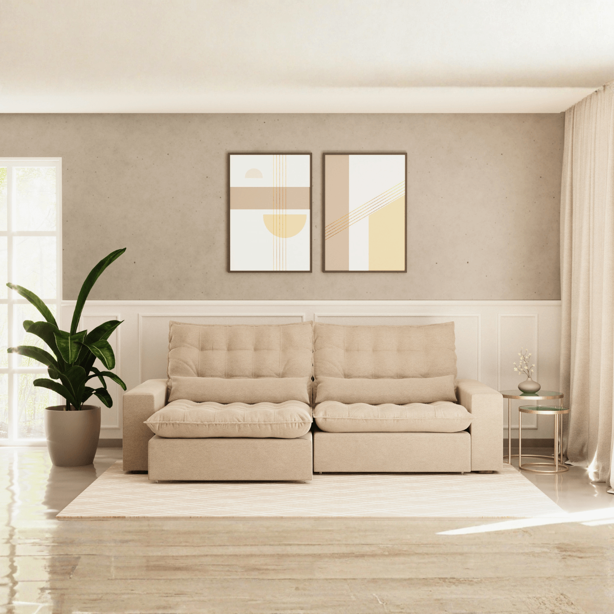 Assento em mola ensacada e espuma D-28 soft que proporciona mais conforto e durabilidade. - Encosto reclinável com almofadas fixas em fibra siliconizada ˗ Design moderno e elegante. ˗ Materiais de alta qualidade para garantir conforto e durabilidade. ˗ Pillow Top de 18cm - Estofados bipartido e encosto removível para transporte facilitado - Almofadas decorativas inclusas - Seu braço pode ser de 20cm .